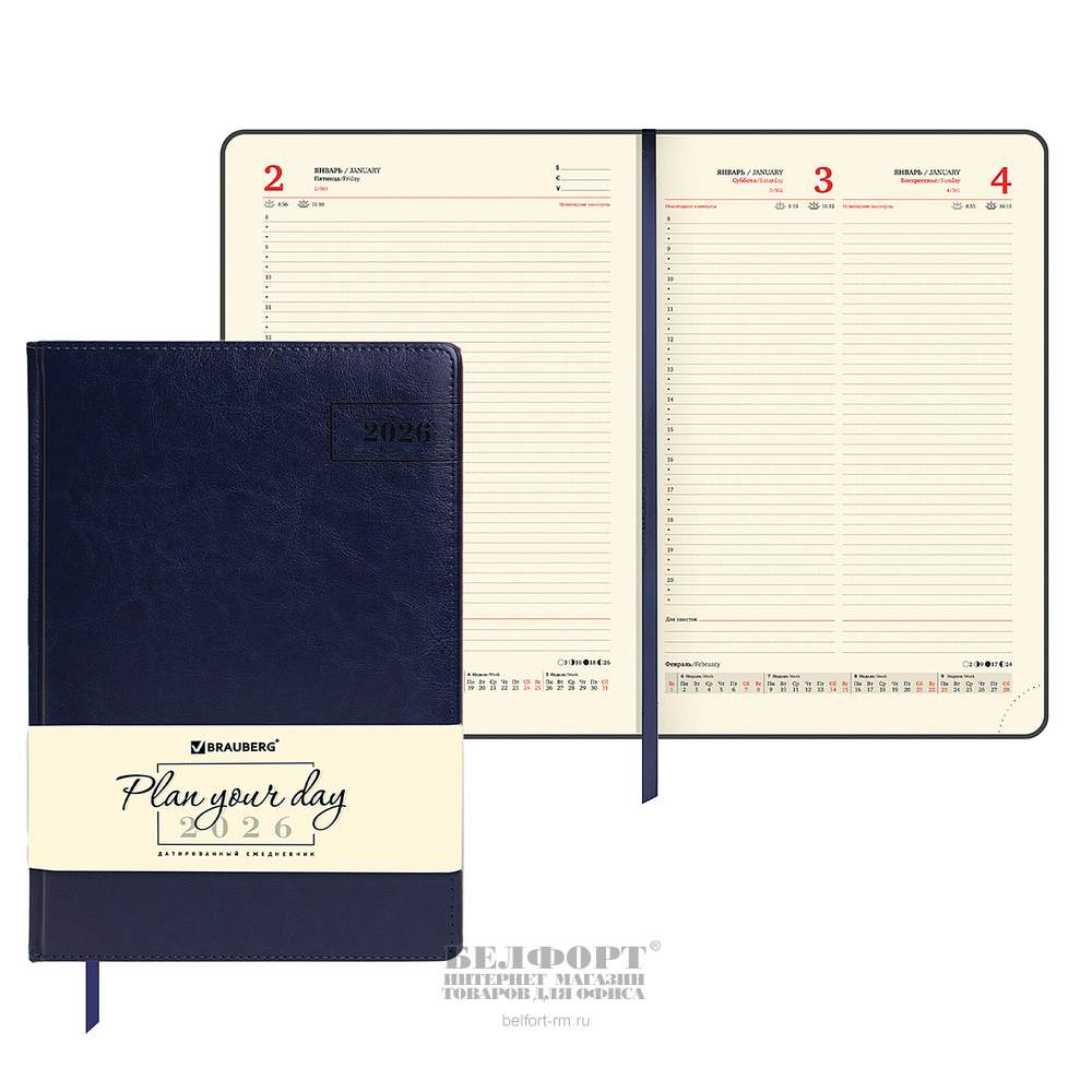 Ежедневник 2026г. А4, кожзам, Brauberg, "Imperial", 168л, в твердом переплете, синий, кремовый блок, ляссе, скругленные уголки