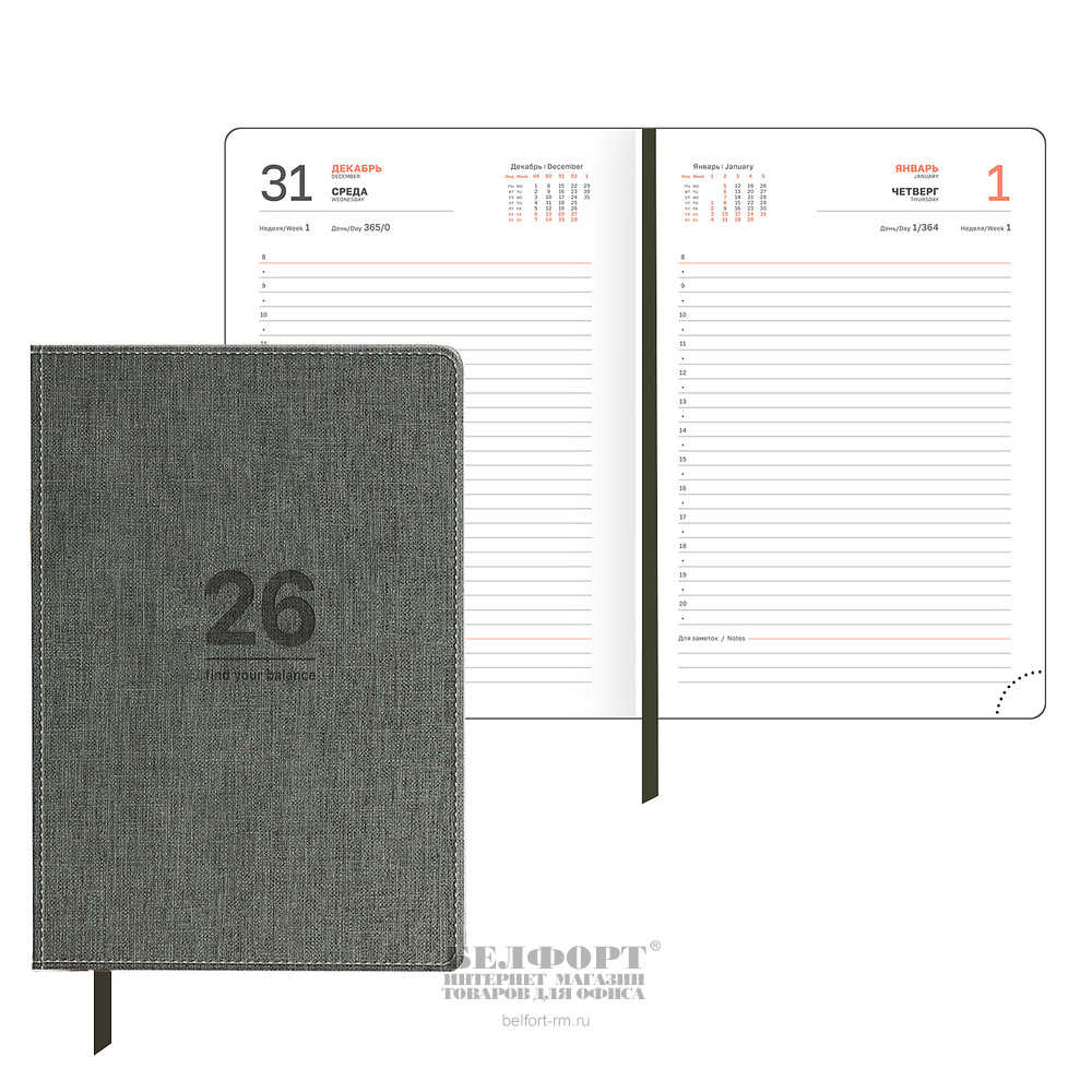 Ежедневник 2026г. А5, кожзам, BG, "Fillsta", "Gray", 176л, 205мм*145мм, в твердом переплете, серый, белый блок, ляссе, 70г⁄м²