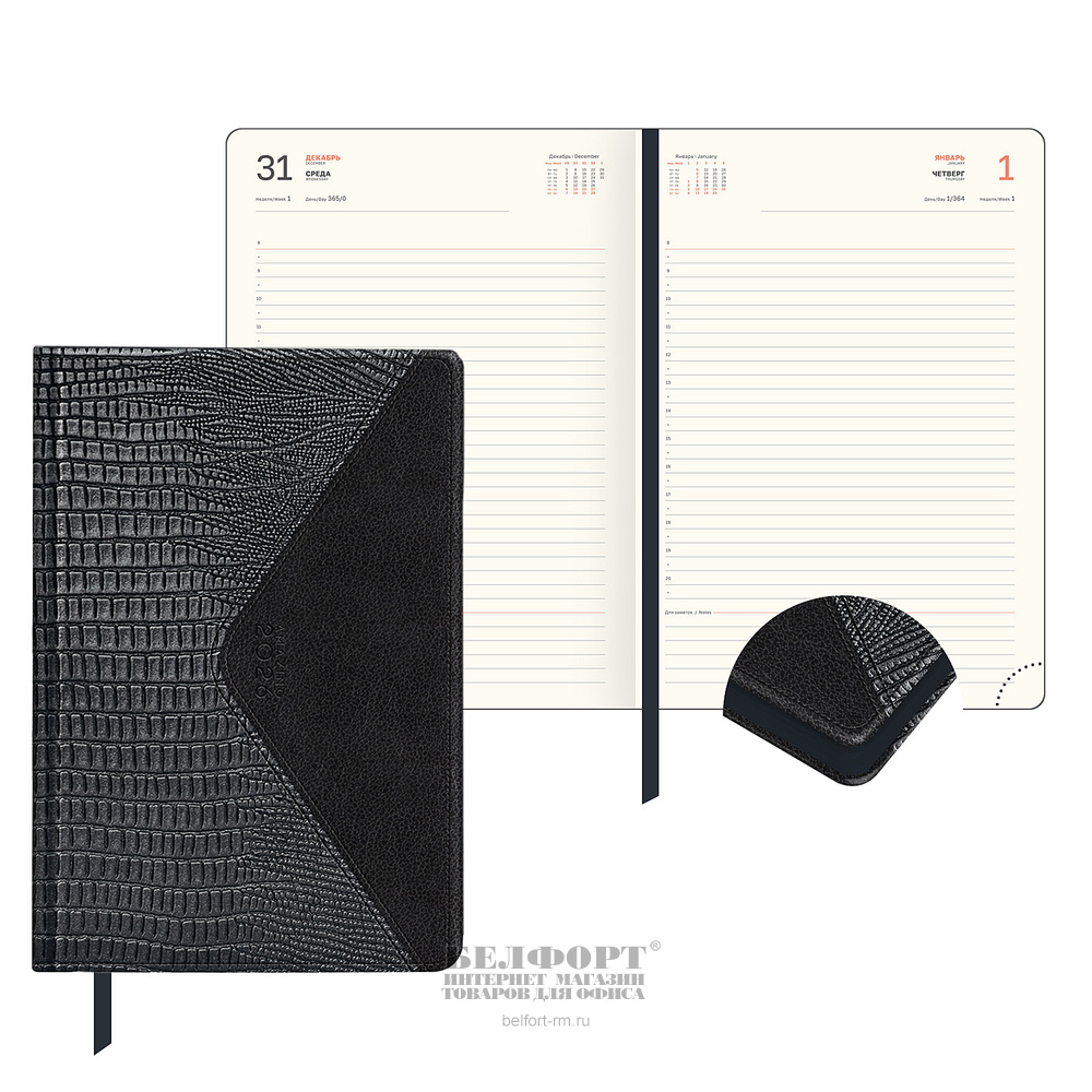 Ежедневник 2026г. А5, кожзам, BG, "Reptile", "Steel", 176л, 205мм*145мм, в твердом переплете, черный, тонированный блок, ляссе, черный срез, 70г⁄м²