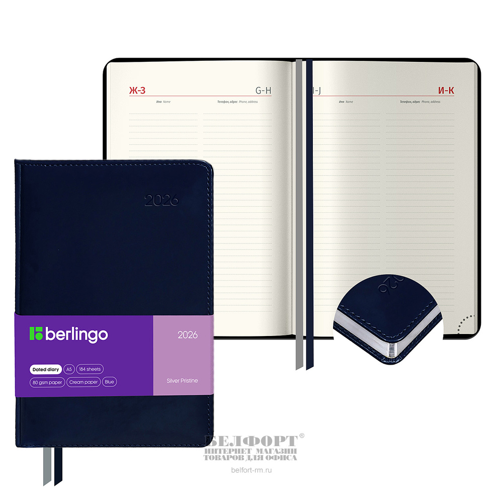 Ежедневник 2026г. А5, кожзам, Berlingo, "Silver Pristine", 184л, 215мм*150мм, в твердом переплете, синий, кремовый блок, ляссе, серебристый срез, 80г⁄м²