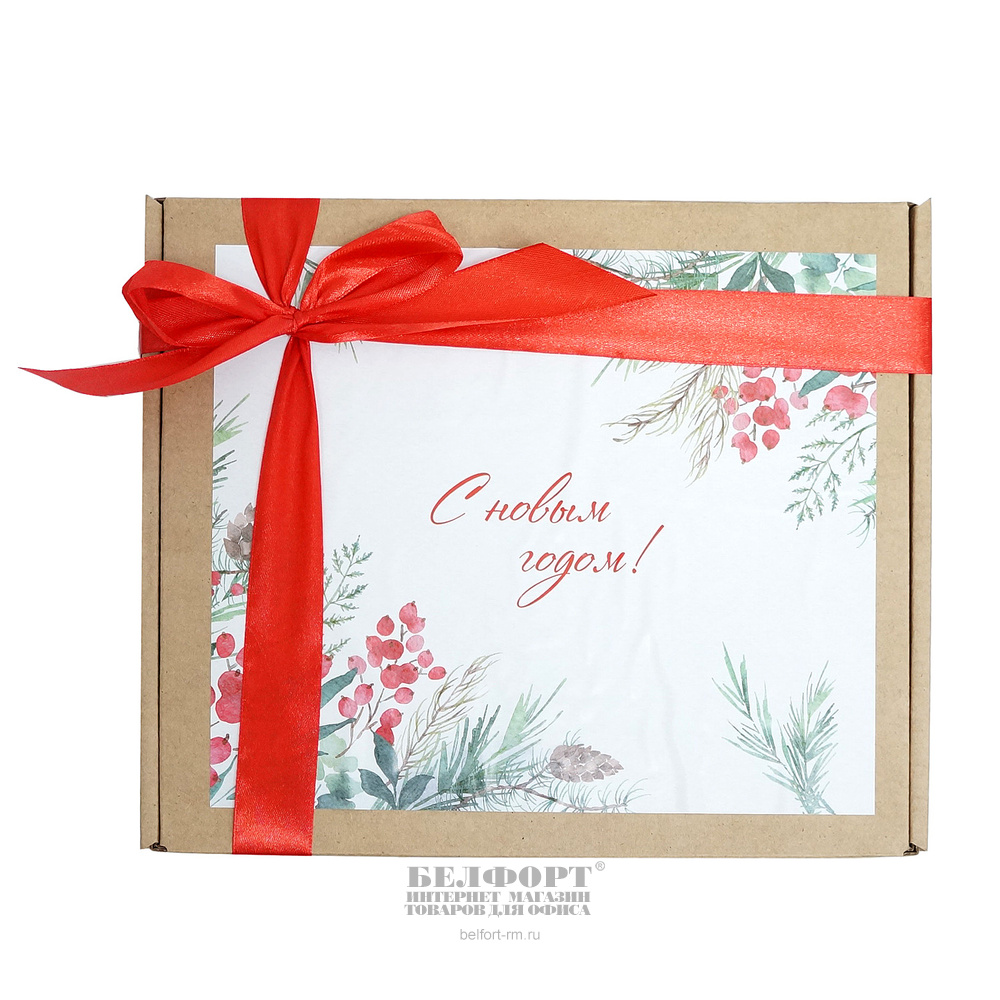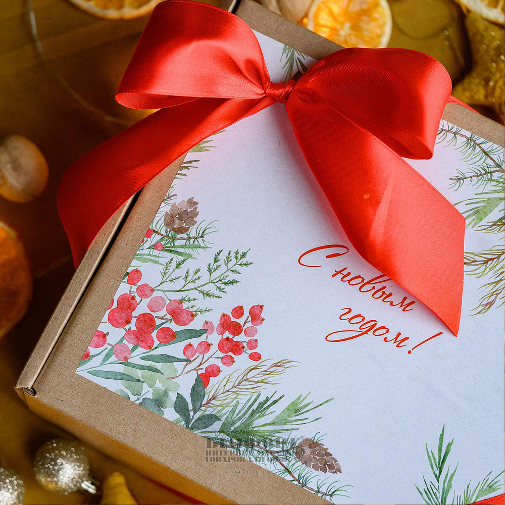 • Крафт-коробочка, перевязанная красной атласной лентой. Наклейка "С новым годом!". Размер коробочки: 22*25*8см.