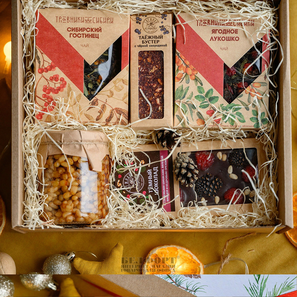 Подарочный набор Травники Сибири, "Большой новогодний", 5 предметов, Сибирский гостинец 50г, Ягодное лукошко 50 г, варенье 250мл, бустер, шоколад