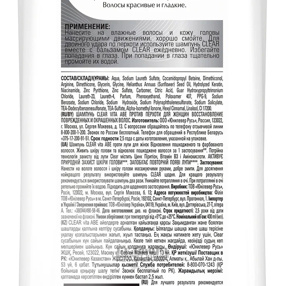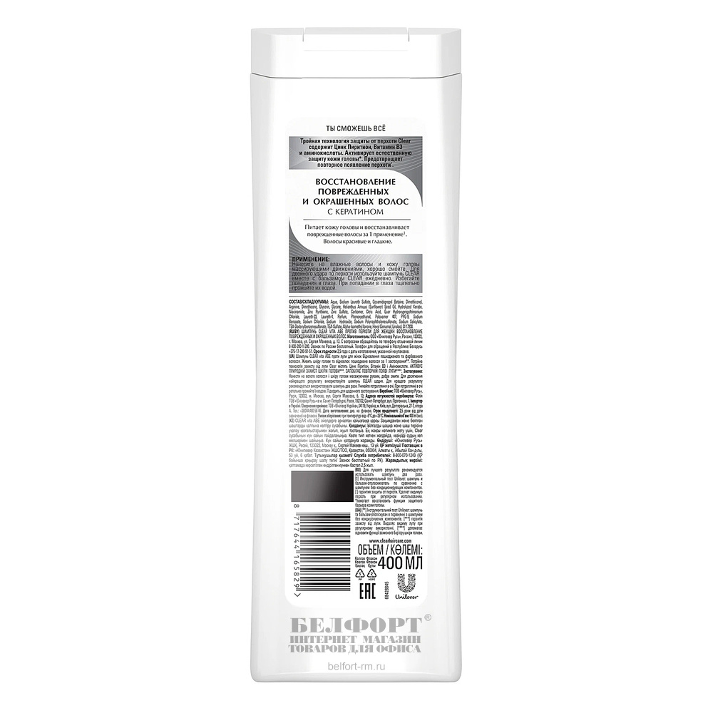 Шампунь Клиар, "Восстановление поврежденных и окрашенных волос против перхоти", 400мл, универсальный