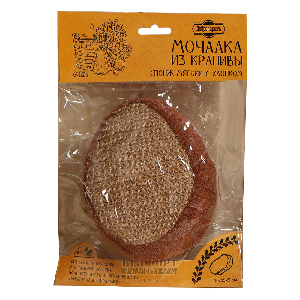 Губка банная Добропаровъ, 15см*10см*5см, крапива (рами), спонж с хлопком, коричневая Фотографии на сайте могут иметь незначительные расхождения с фактическим внешним видом и комплектностью поставляемого товара
