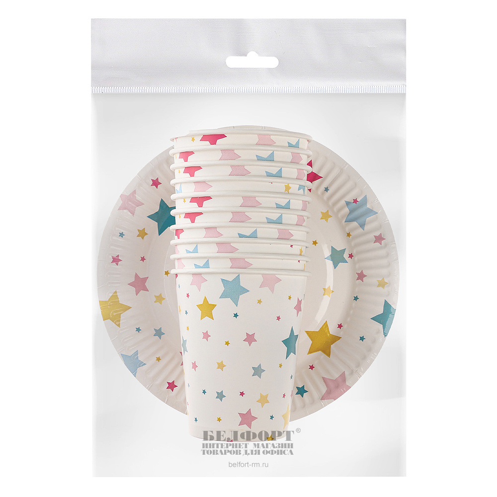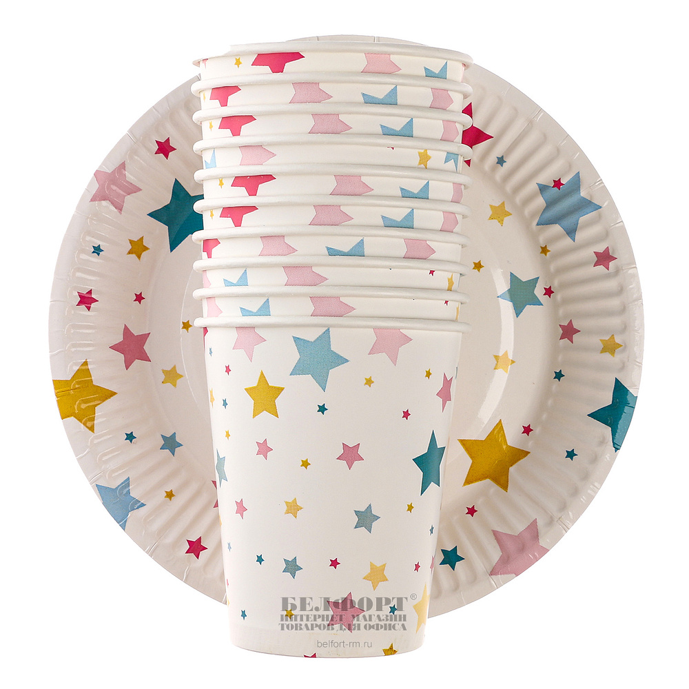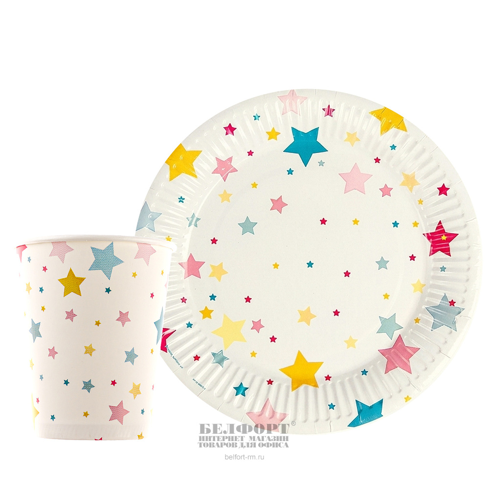 Набор посуды картон, Страна Карнавалия, "Звезды", белый, 19 см, 20шт, 10 тарелок, 10 стаканов