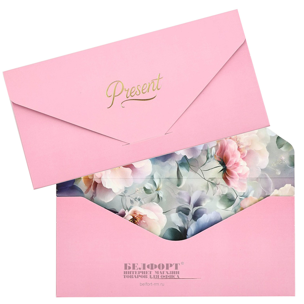 Конверт для денег "Present. Нежные цветы", 19см*9см, soft touch, тиснение, розовый