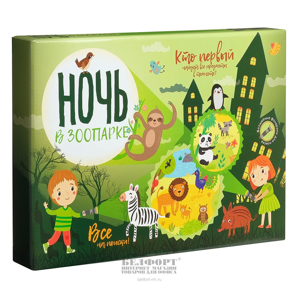 Ночь в зоопарке – увлекательная игра для детей и взрослых. Отправляйтесь в ночной зоопарк с настольной игрой из серии "Интересный мир"! В наборе вы найдете целых 100 карточек с предметами, специальное игровое поле и 2 фонарика. "Светите" фонариком в "темноту", опередите соперника и найдите всех животных в ночном зоопарке. Кто первым найдет льва? Кто проверит, спит ли белка? А кто сможет перечислить всех животных на букву "к"?