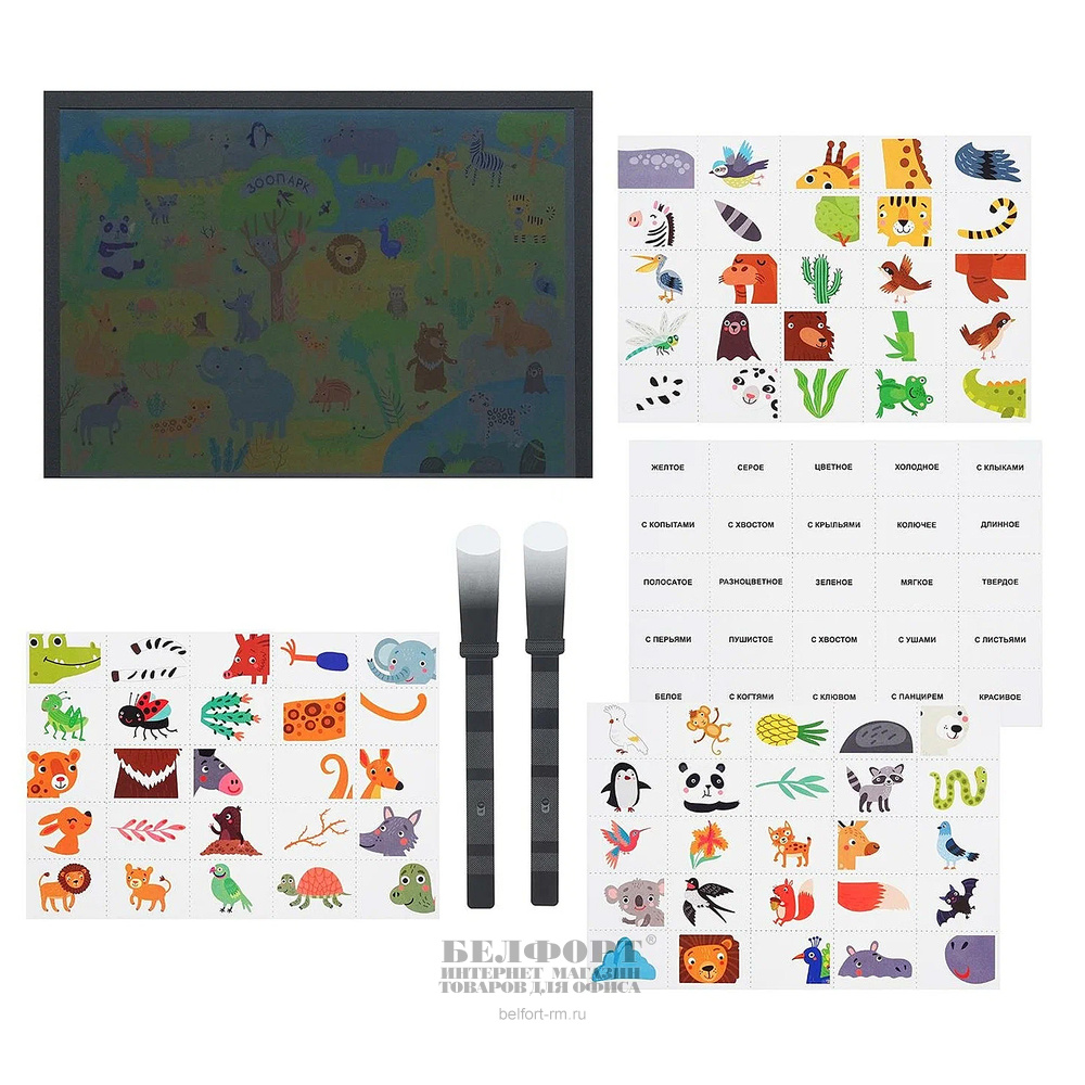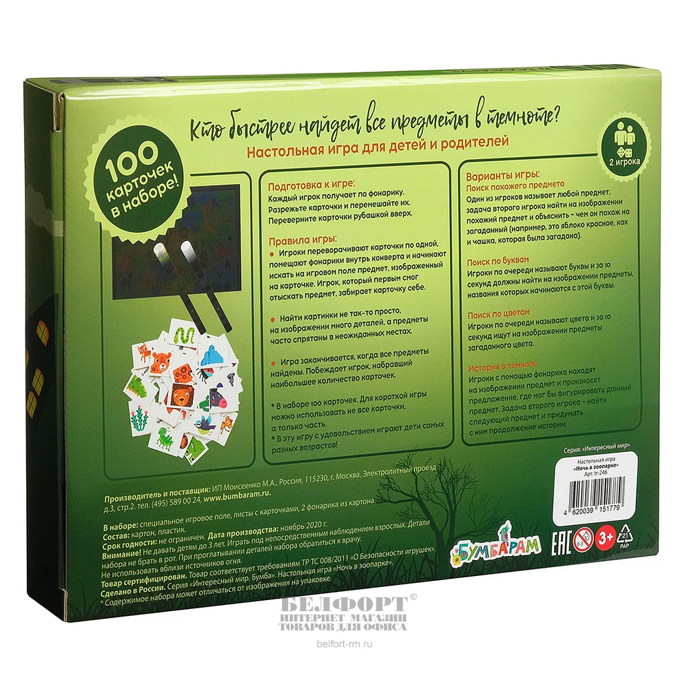 В наборе: специальное игровое поле с эффектом "темноты", листы со 100 карточками, 2 фонарика из картона