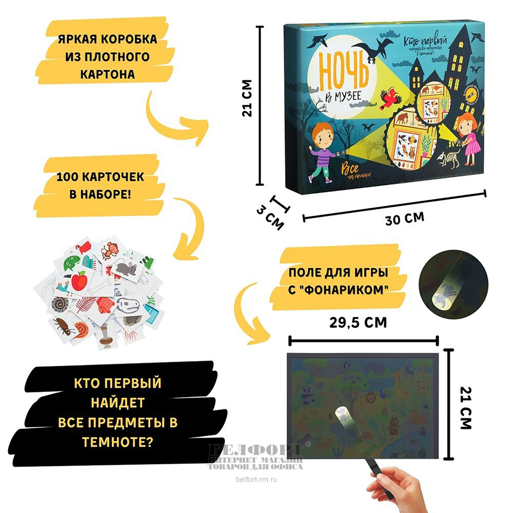 Ночь в музее — это увлекательная настольная игра для детей и родителей. В наборе вы найдете целых 100 карточек с предметами, специальное игровое поле и 2 фонарика из картона. Переворачивайте карточки, опередите соперника и с помощью фонариков ищите на игровом поле предметы, изображенные на карточке. Выигрывает тот, кто первым найдет все предметы в "темноте". Увлекательная настольная игра тренирует внимательность и сообразительность и ловкость. Это оригинальный подарок и замечательный способ провести время с ребенком.