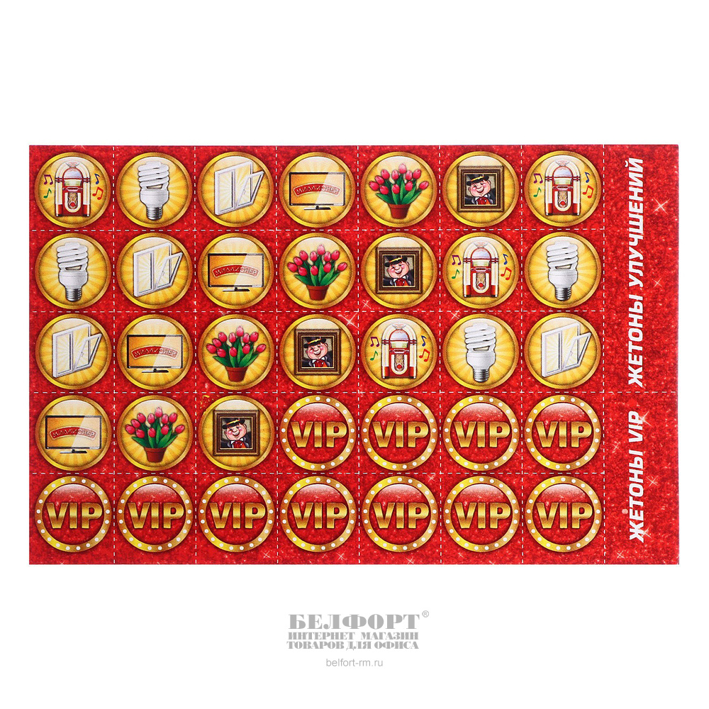 Игра представлена красочно исполненным игровым полем, фишками, карточками, жетонами, игровыми деньгами и кубиками.