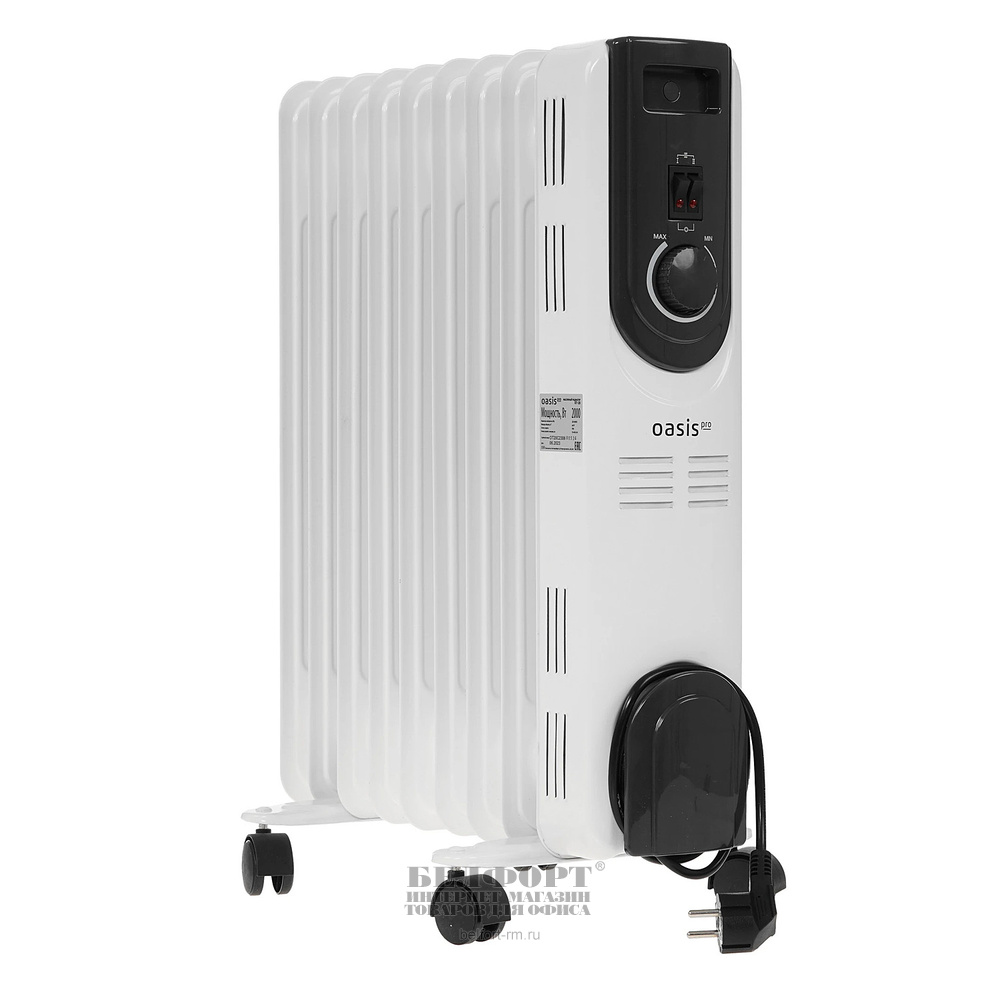 Масляный обогреватель Оasis Pro OT-20 работает бесшумно и отличается высокими показателями теплообмена. Он выполнен в металлическом корпусе, устойчивом к нагреву и механическим повреждениям. Модель мощностью 2000 Вт предназначена для помещения площадью до 20 м². Конструкция обогревателя состоит из 9 секций. Механический термостат автоматически поддерживает заданный температурный режим.