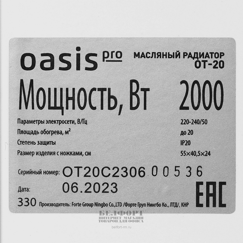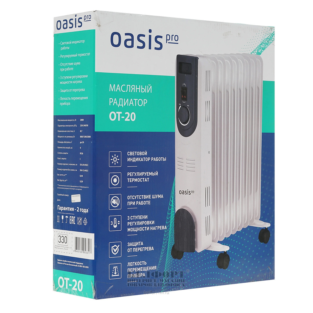 На боковой стороне расположены позиционные переключатели мощности со световыми индикаторами и поворотный механизм для плавной настройки интенсивности обогрева. Ножки-опоры с колесами и ручка из термостойкого пластика гарантируют удобное перемещение в нужное место. На корпусе предусмотрен отсек под намотку сетевого шнура. Для безопасности в масляном обогревателе Оasis Pro OT-20 реализована технология отключения при перегреве.