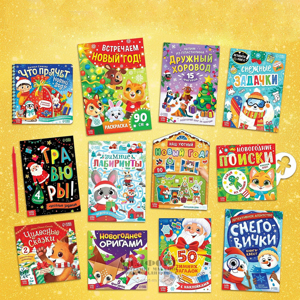 12 разнообразных книг: задания, наклейки, раскраски, лабиринты, оригами и гравюры.