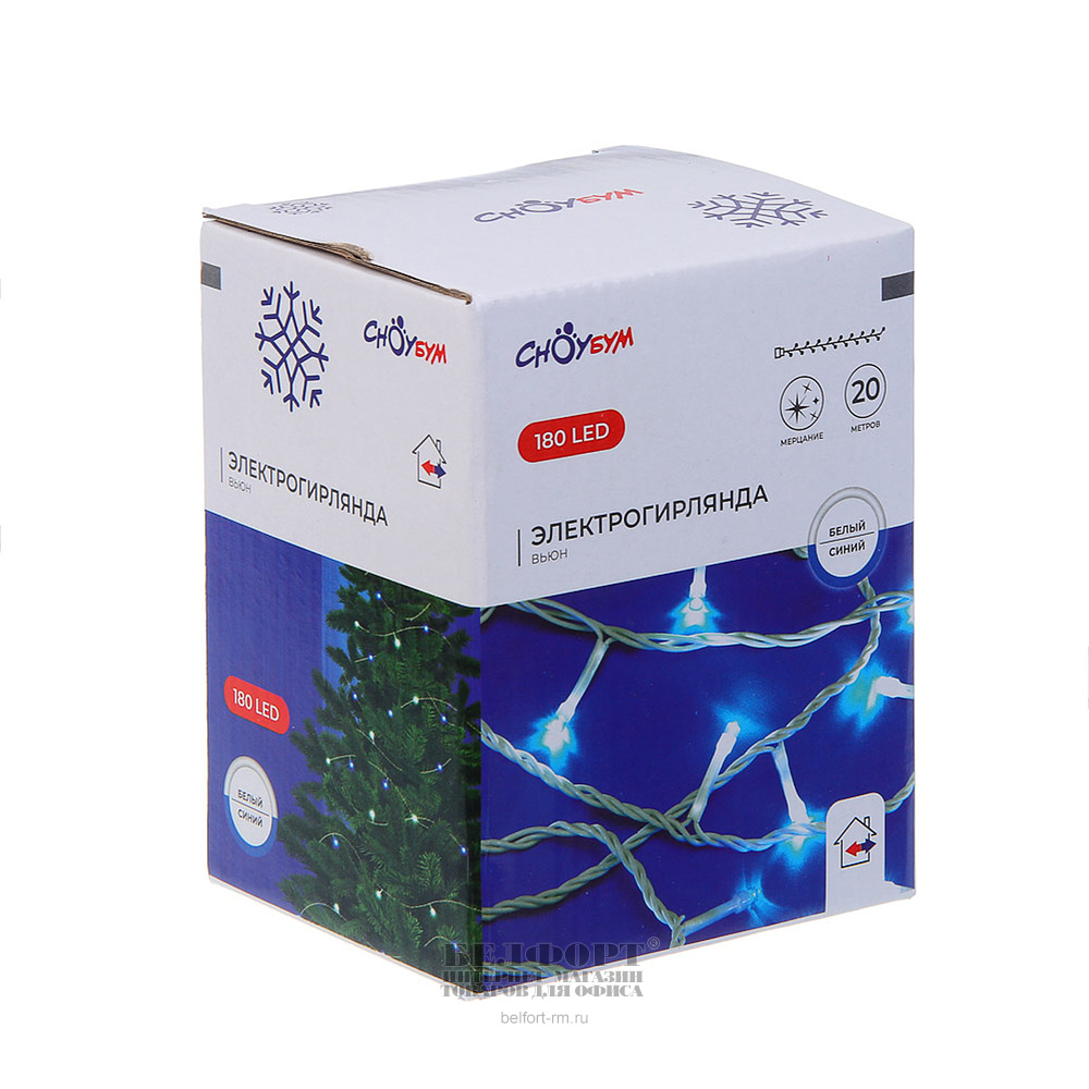 Электрогирлянда LED 20м, 180шт.лампочек, белая+синяя, Нить, Сноу Бум, Фотографии на сайте могут иметь незначительные расхождения с фактическим внешним видом и комплектностью поставляемого товара