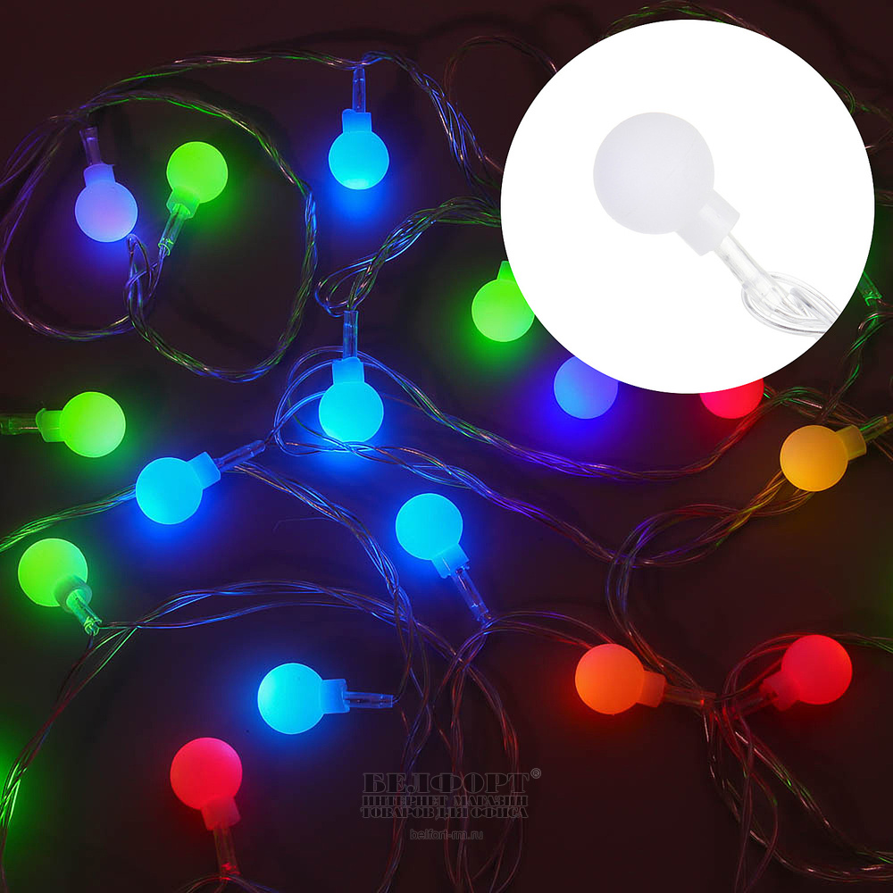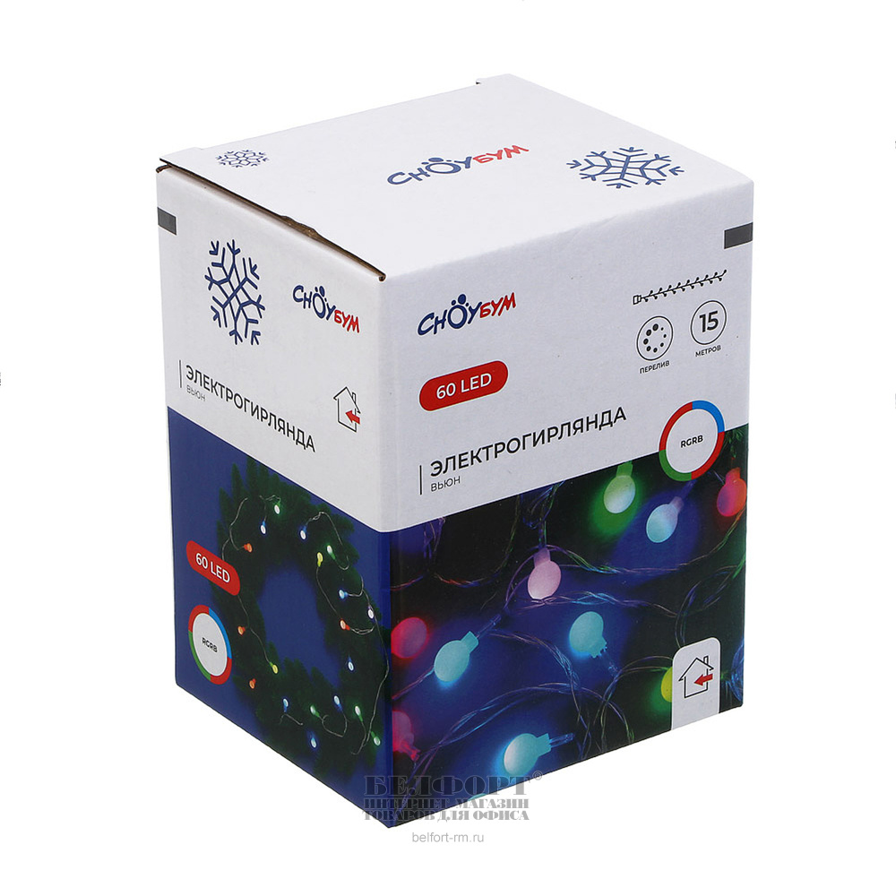 Электрогирлянда LED 15м, 60шт.лампочек, мульти, Нить, Сноу Бум, "Шар", для помещений, RGRB, мерцание, провод ПВХ прозрачный, 220В
