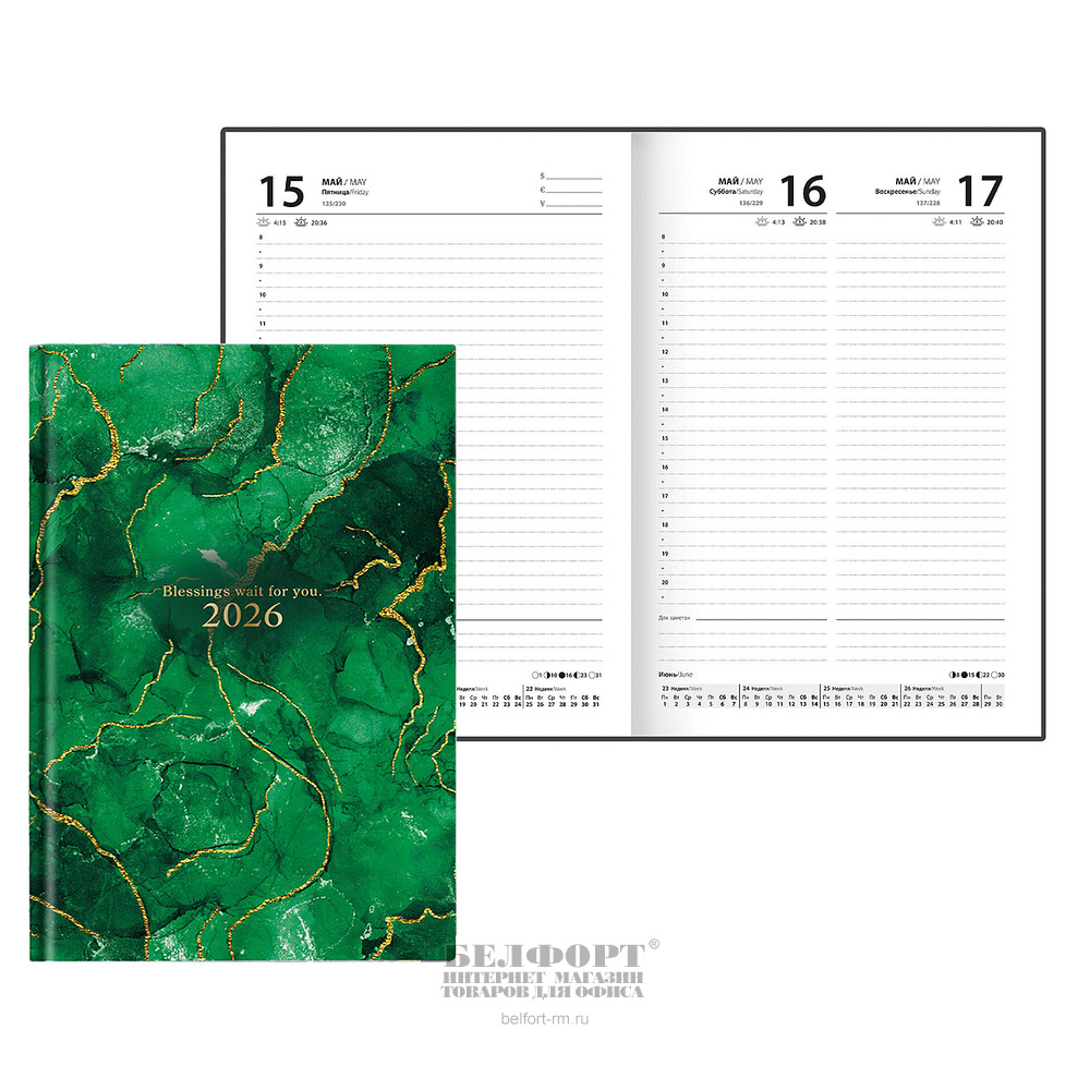 Ежедневник 2026г. А5, картон ламинированный, Staff, "Green Marble", 160л, 215мм*145мм, в твердом переплете, зеленый, белый блок, 60г⁄м², глянц. лам.