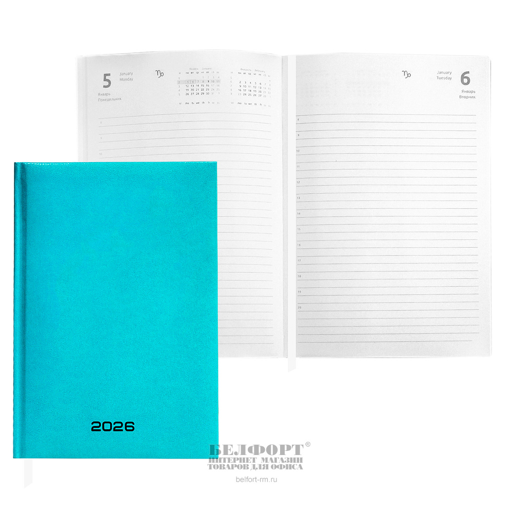 Ежедневник 2026г. А5, бумвинил, Attomex, "Even", 168л, 205мм*145мм, в твердом переплете, бирюзовый, белый блок, ляссе, с поролоном, шелкография