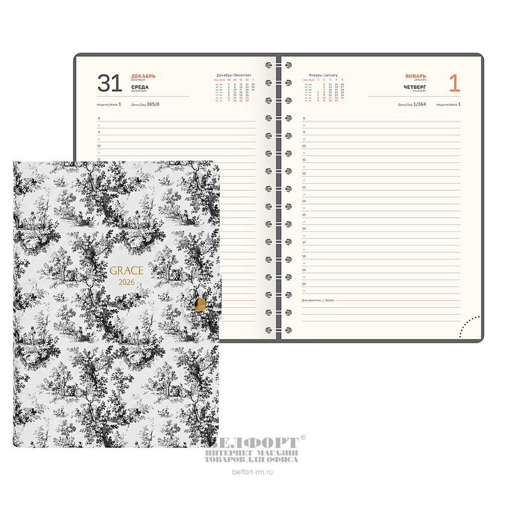 Ежедневник 2026г. А5, экокожа, BG, "Grace", "Garden", 176л, 205мм, 145мм, на спирали(гребне), белый, синий, кремовый блок, 70г⁄м², на кнопке