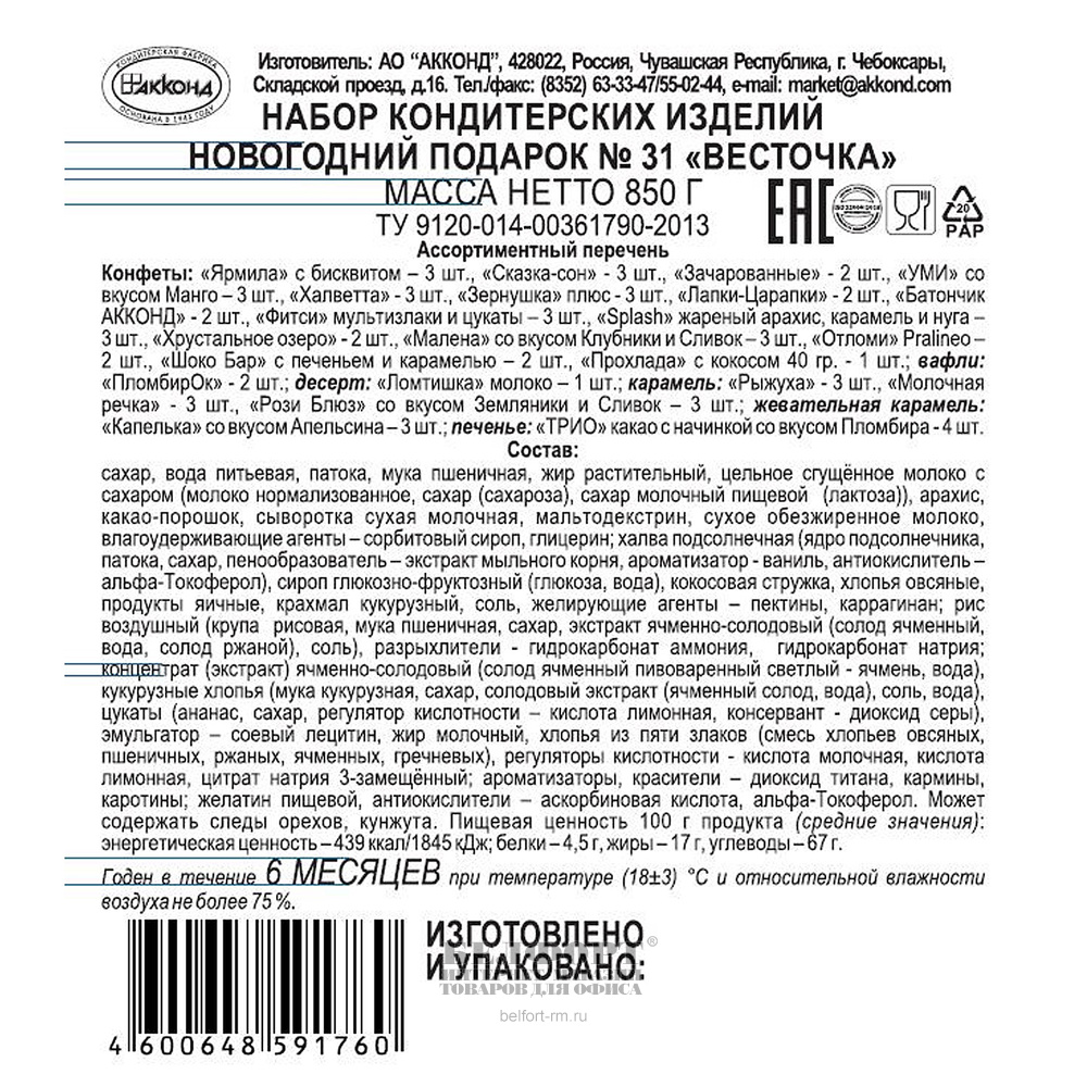 Новогодний подарок Акконд, "Весточка", 850г, в картонной упаковке