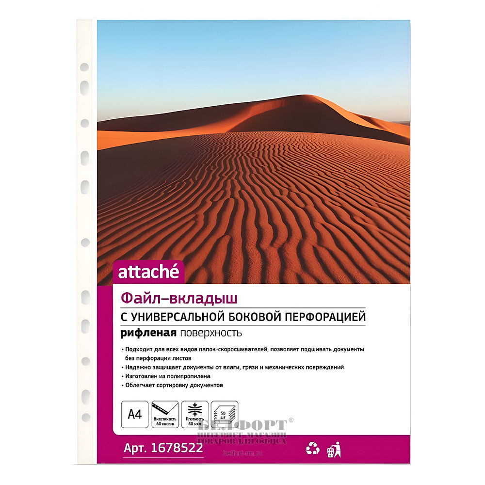 Добавить к сравнению251880Есть в наличии 46 уп.Папка-файл 90мкм, А4, Attache, глянцевая, с перфорацией, 50шт