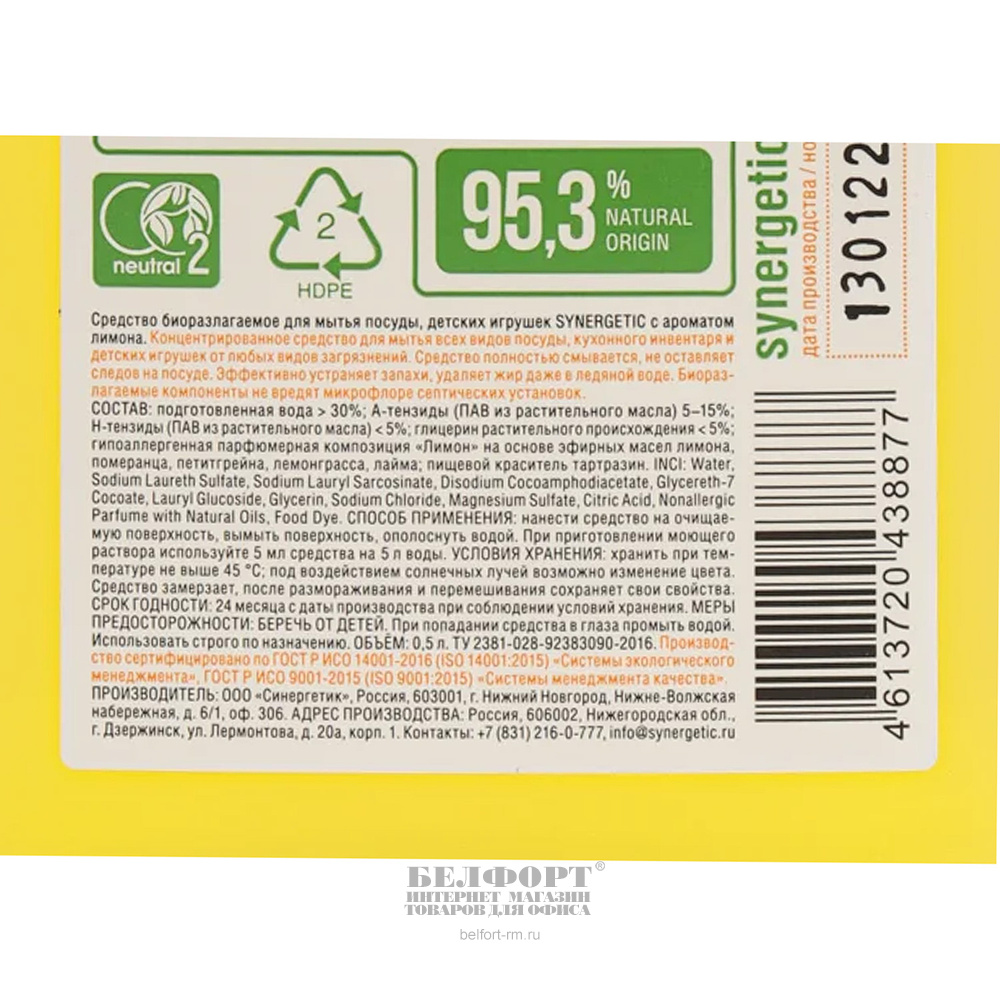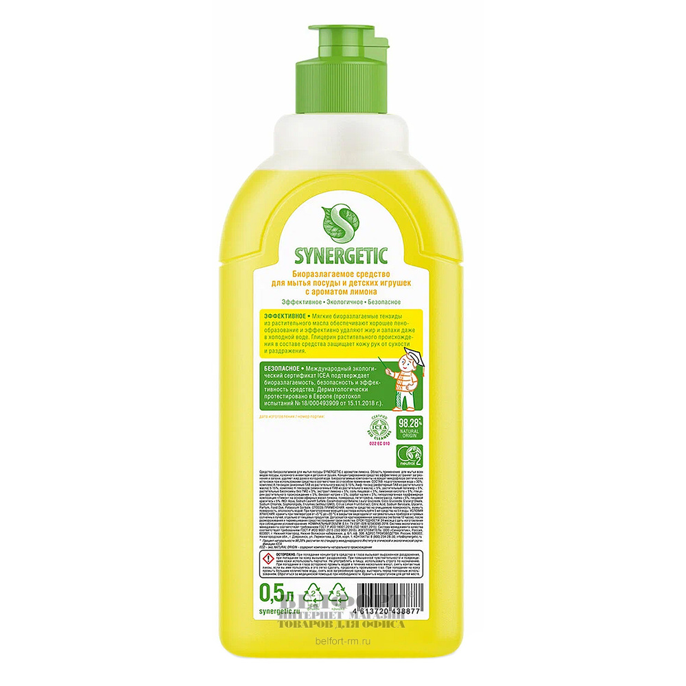 Средство для мытья посуды, овощей, фруктов и игрушек Synergetic, "Лимон", 500мл, детское, антибактериальное, флип-топ