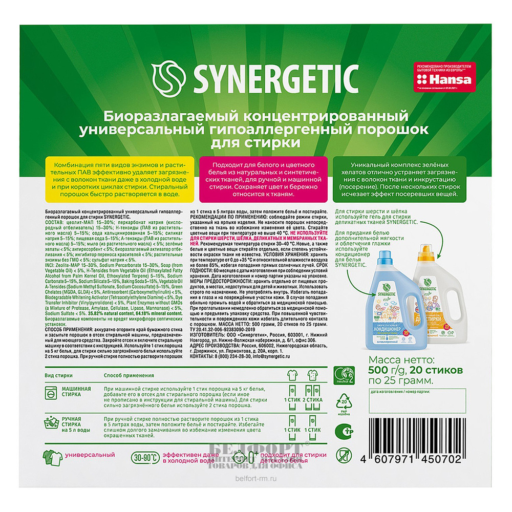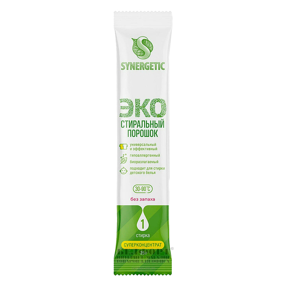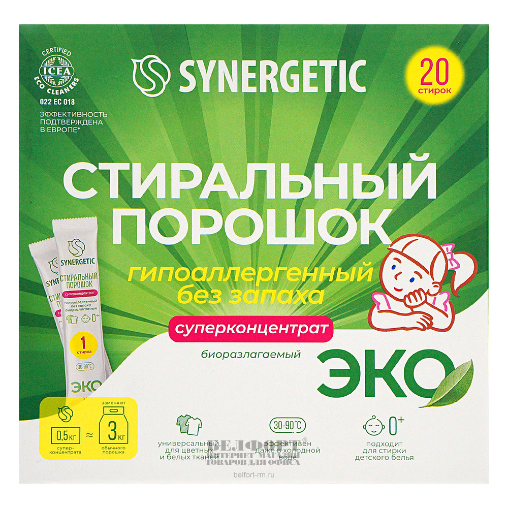 Порошок стиральный Synergetic, 20 стиков=3кг, автомат, гипоаллергенный, биоразлагаемый