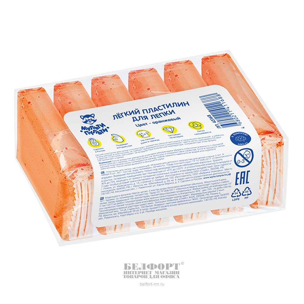 Пластилин легкий 6шт, 60г, Мульти-Пульти, оранжевый, в пакете