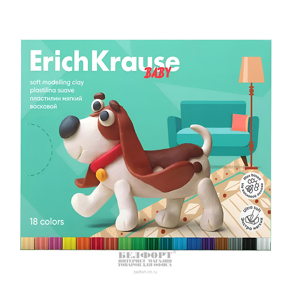 Пластилин мягкий 18цв, 234г, восковой, Erich Krause, "Baby", со стеком, картон. уп.