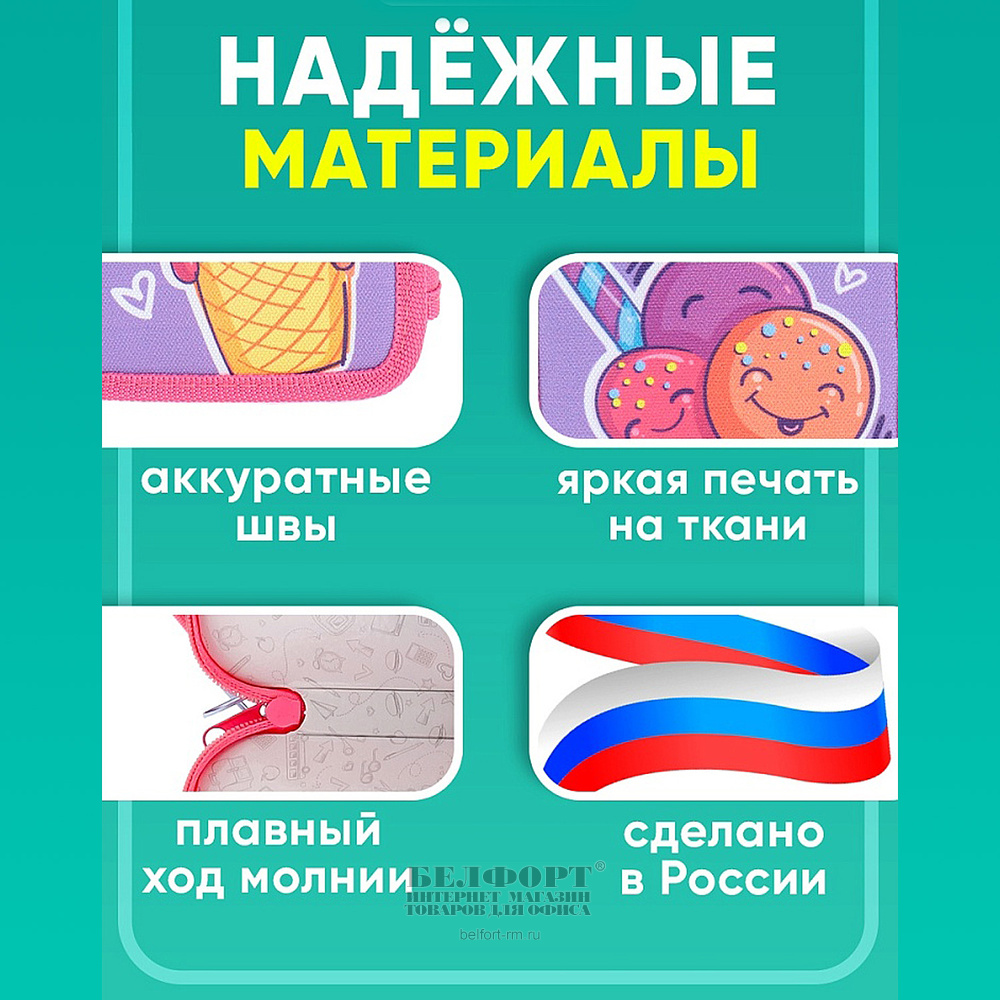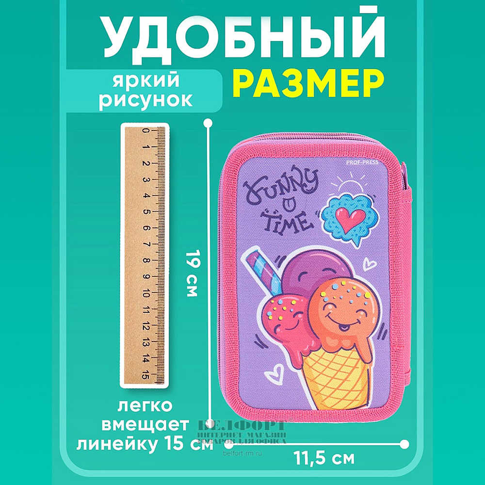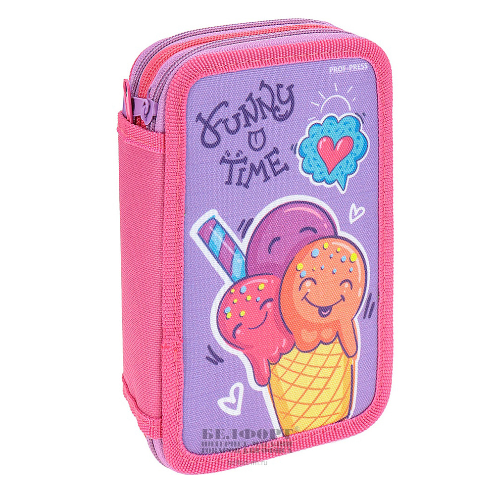 Пенал 3-х секционный, 19см*11,5см, ткань, печать на ткани, Prof-Press, "Смешное мороженое"