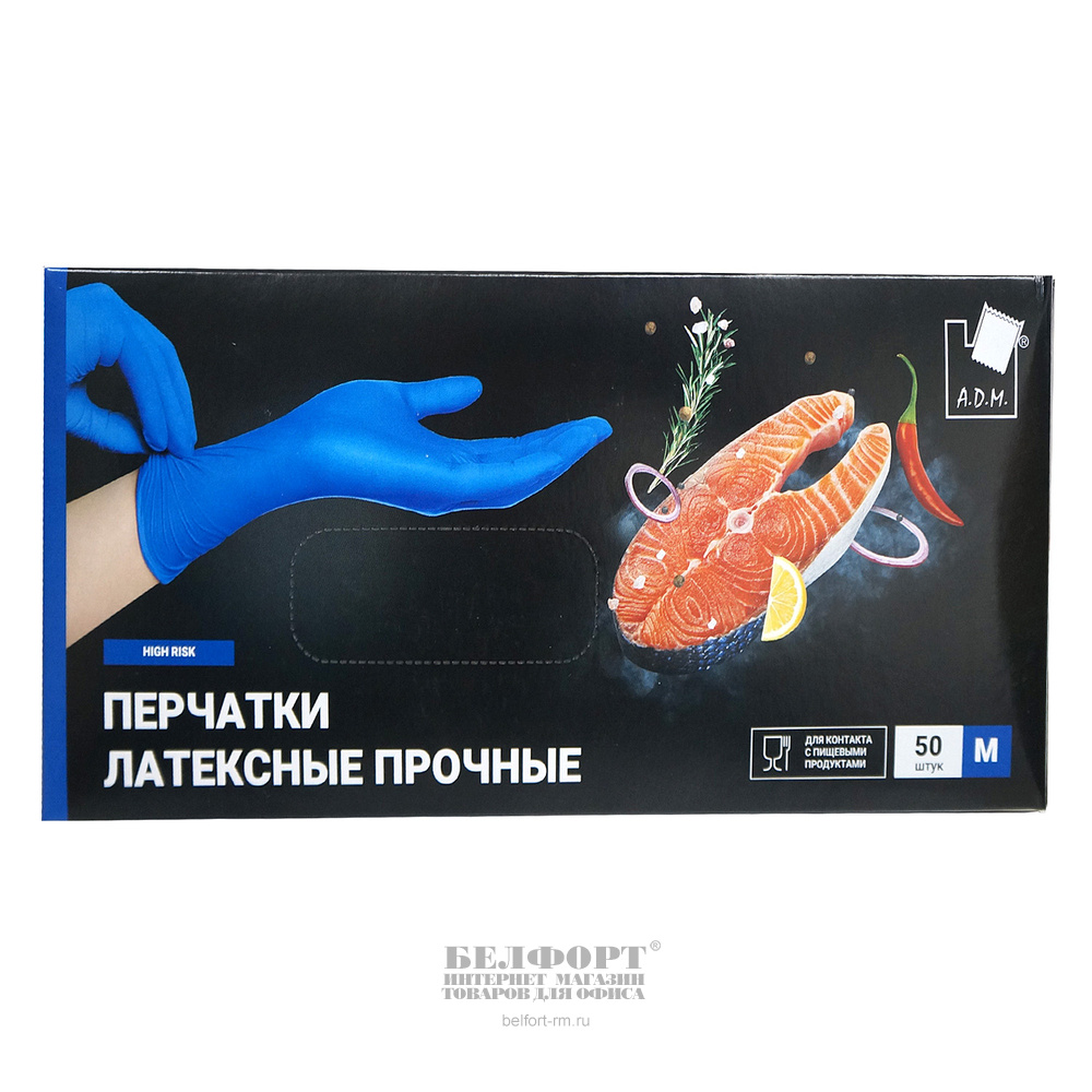 Перчатки нестерильные неопудренные, А.Д.М., латекс, синие, текстурированные на пальцах, прочные, размер M, упак. 25 пар Фотографии на сайте могут иметь незначительные расхождения с фактическим внешним видом и комплектностью поставляемого товара