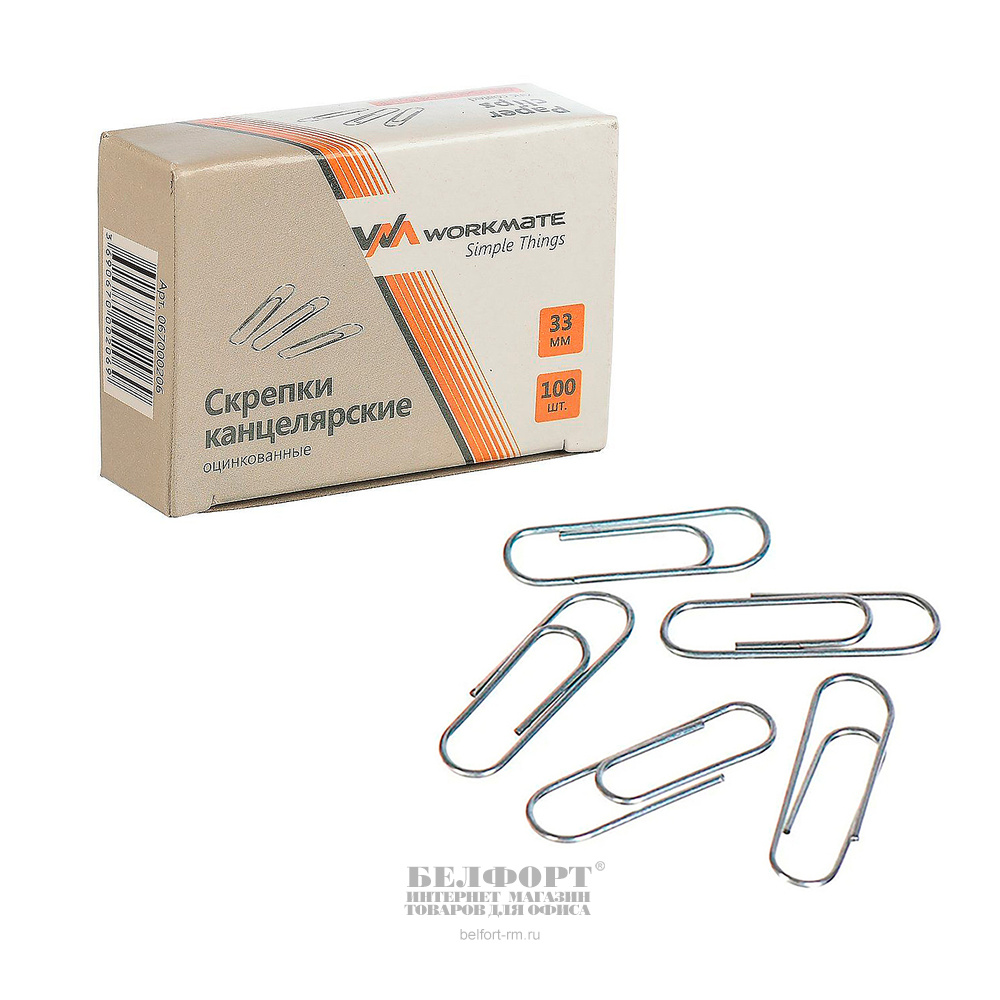 Скрепки овальные, 33мм, оцинкованные, Workmate, 100шт, картон. уп.