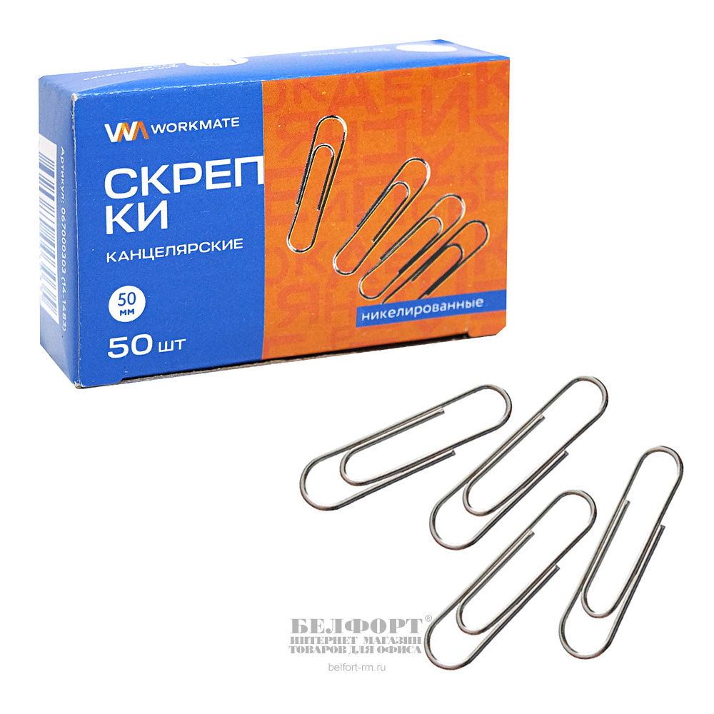 Скрепки овальные, 50мм, никелированные, Workmate, 50шт, картон. уп.