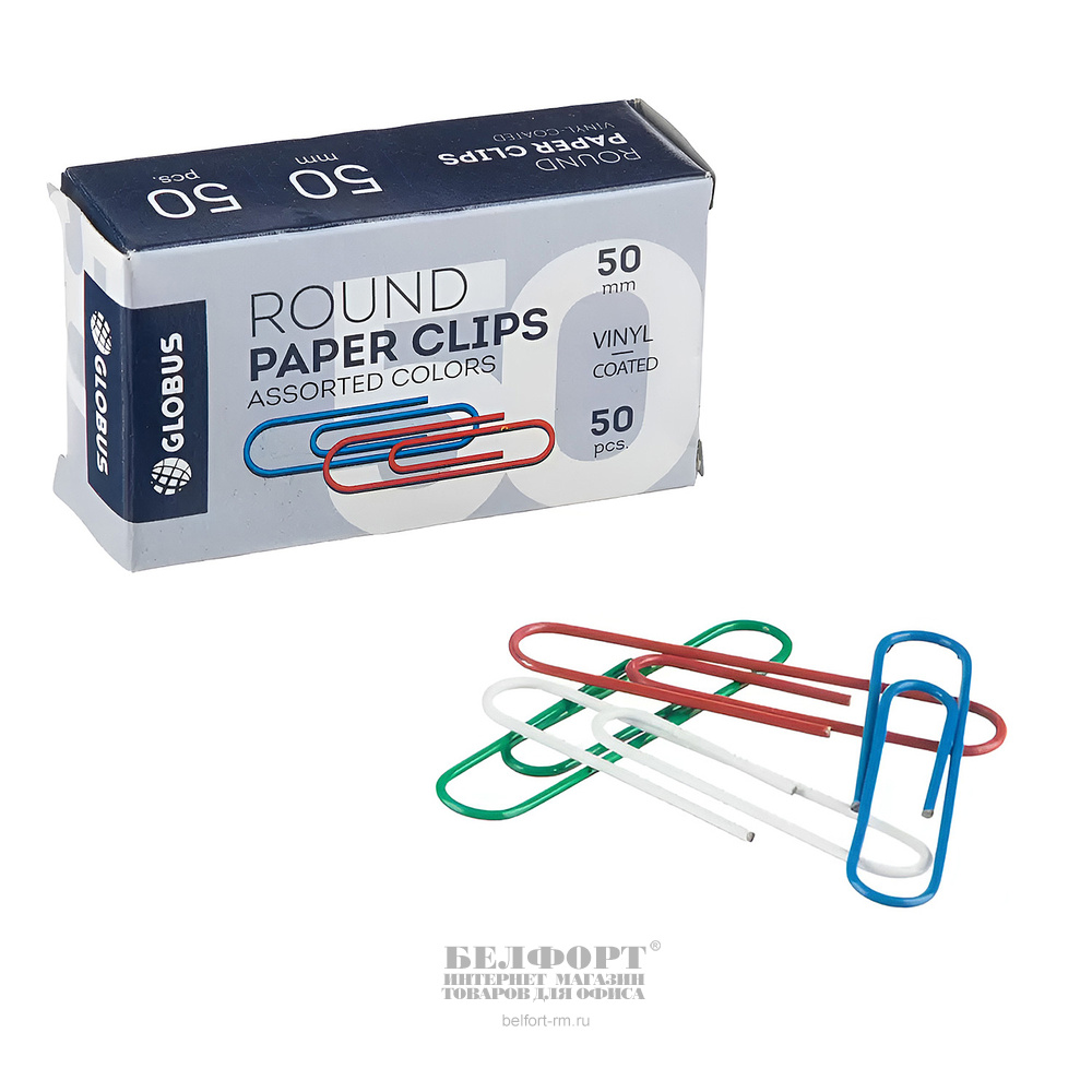 Скрепки овальные, 50мм, цветные, Глобус, 50шт, картон. уп.
