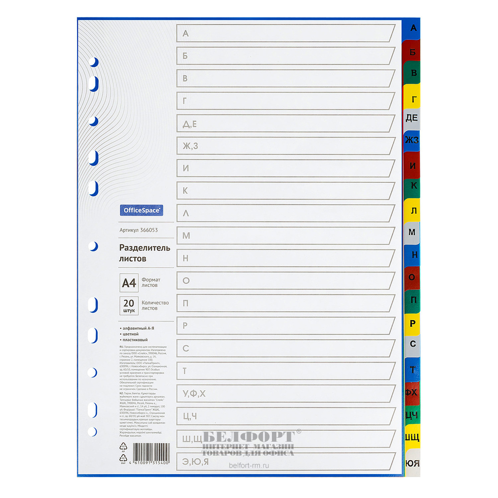 Разделитель листов алфавитный А-Я А4, пластик, OfficeSpace, 20л, цветной