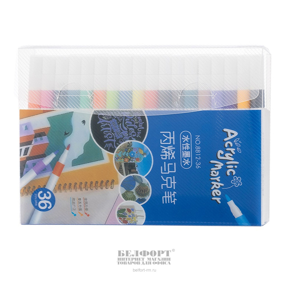 Набор маркеров акриловые, 36шт, Basir, 1мм-2,4мм, ассорти, вентилируемый колпачок, круглый(пулевидный) наконечник, в пенале
