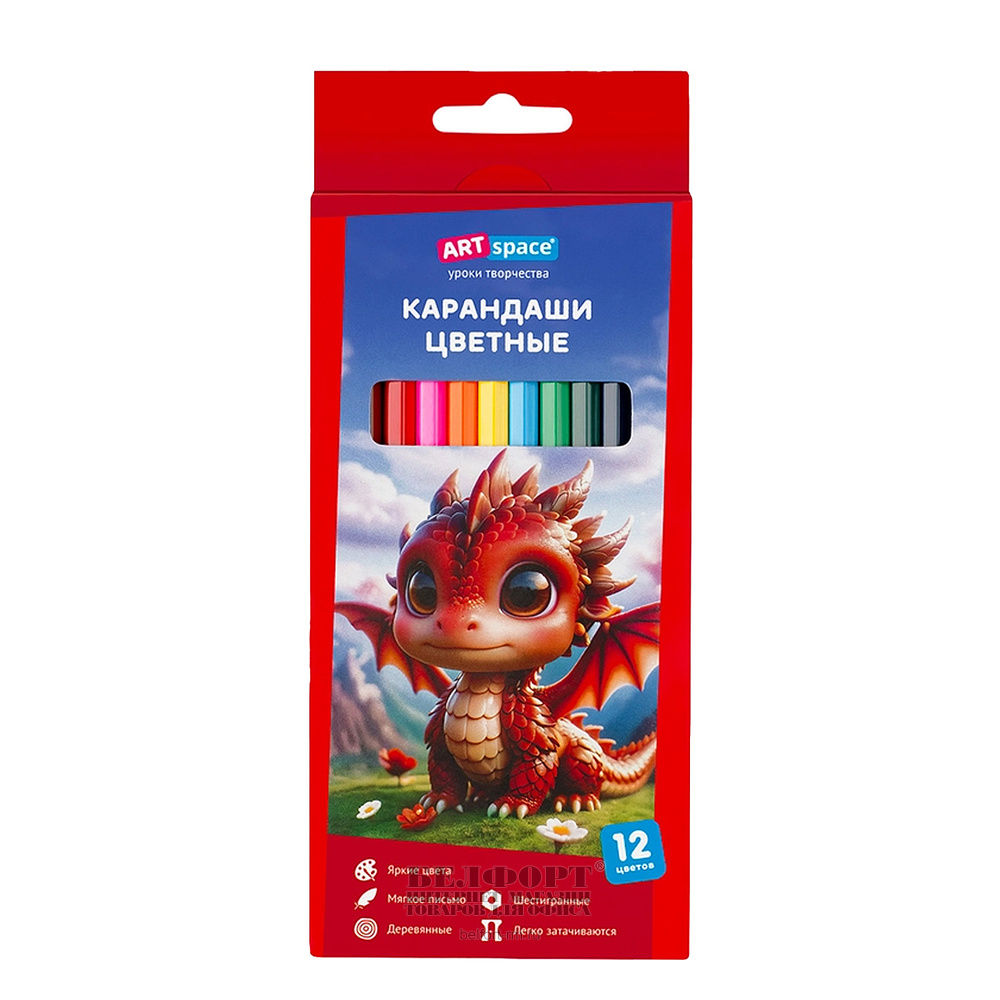 Цветные карандаши 12цв, ArtSpace, "Дракоша", дерево, без ластика, шестигранные, диаметр грифеля 2,6мм, картон. уп.
