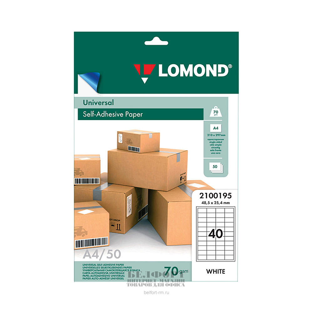 Бумага самоклеящаяся матовая, универсальная, 40 дел., Lomond, 70г⁄м², А4, 50л, белая