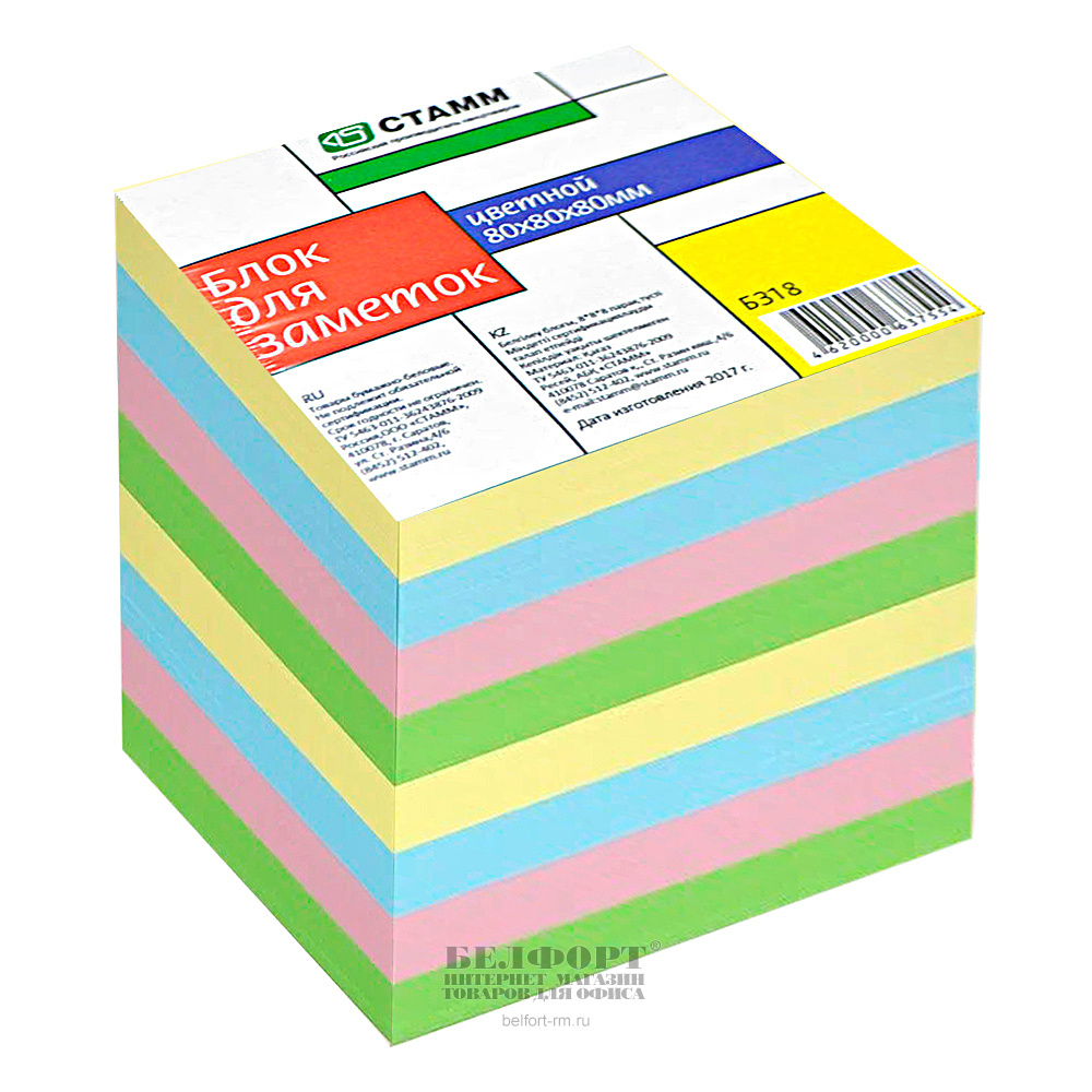 Блок для заметок 80мм*80мм*80мм, цветной, 80г⁄м², СТАММ, 800л
