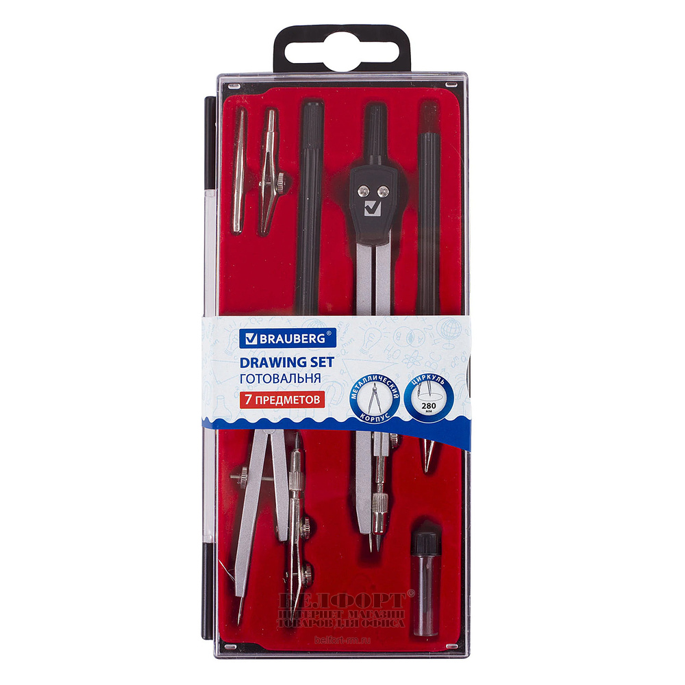 Готовальня 7 предметов, Brauberg, "Architect", циркуль+кронциркуль с рейсф, рейсфедер+держ, грифель, европодвес