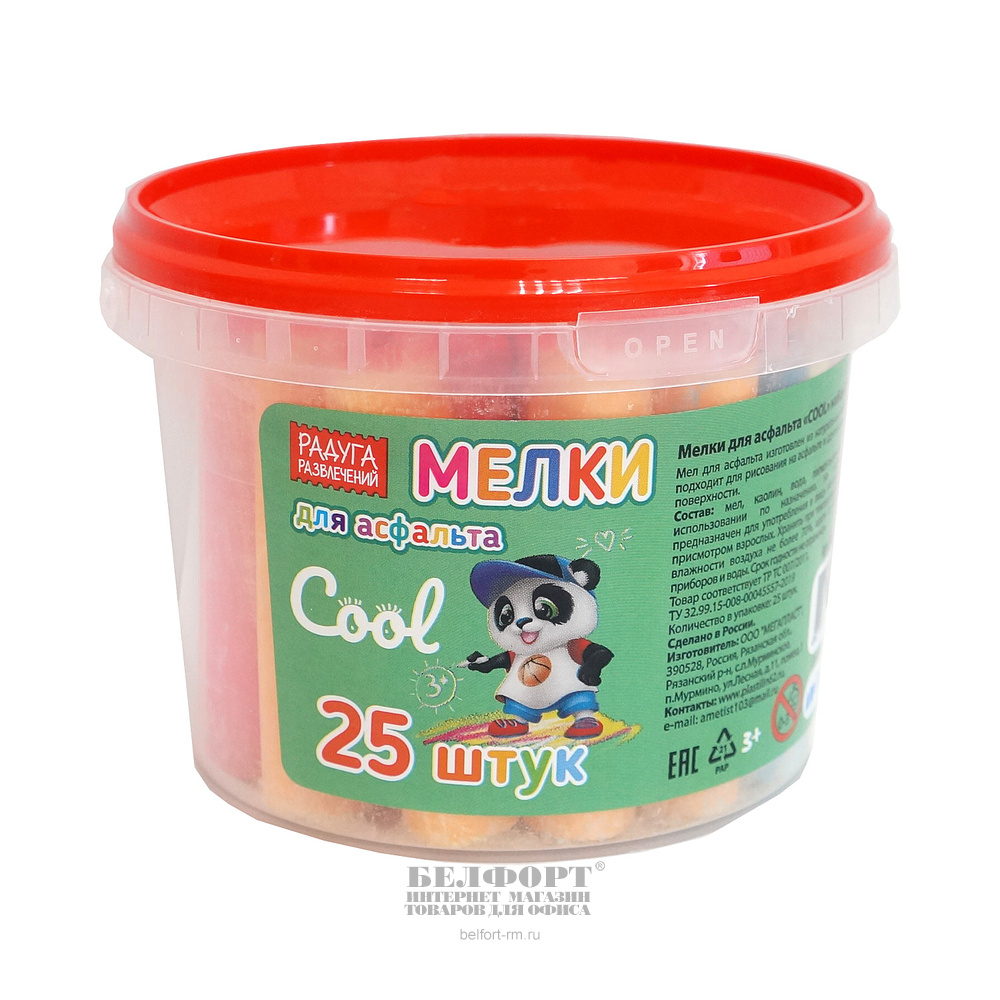 Мел цветной, для асфальта, 6цв, 25шт, Радуга развлечений, круглый, пластик. ведро, средней твердости
