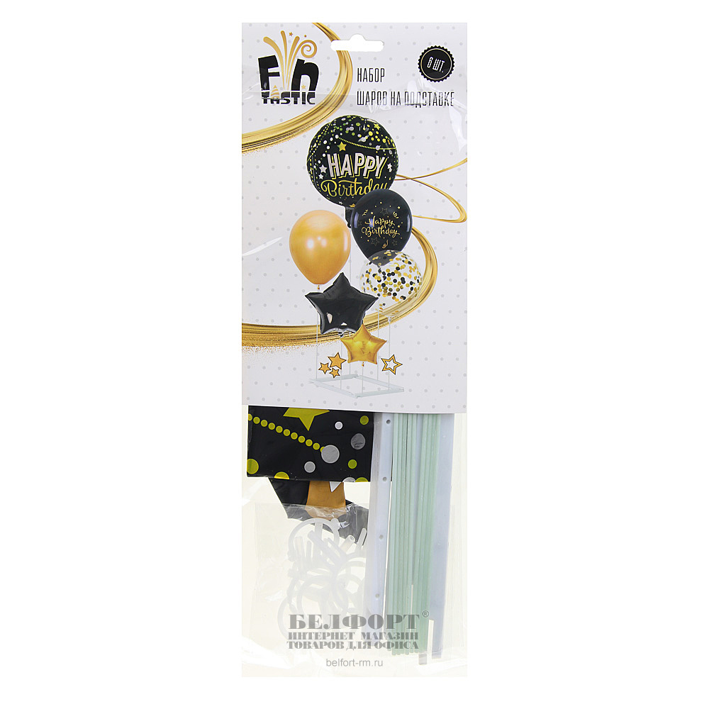 Набор воздушных шаров FNtastic, "Happy Birthday", черный, 18", 6шт, фольга+пластик+картон, с подставкой