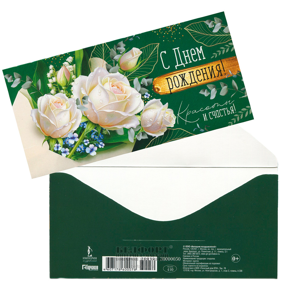 Конверт для денег "С Днем Рождения!", 16,7см*8,2см, белые розы