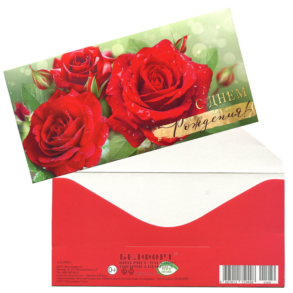 Конверт для денег "С Днем Рождения!", 16,7см*8,3см, розы