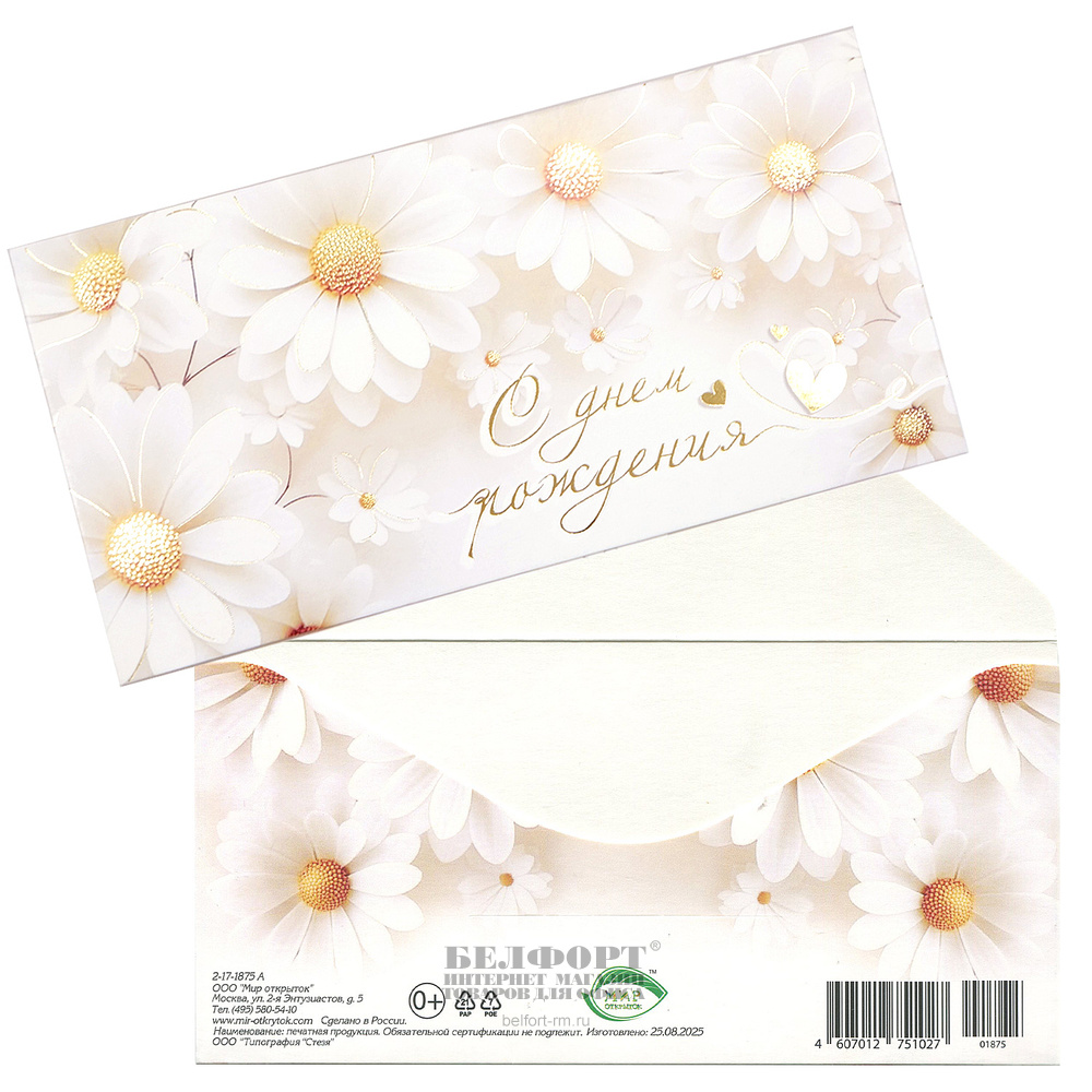 Конверт для денег "С Днем Рождения!", 16,7см*8,3см, белые цветы, фольга