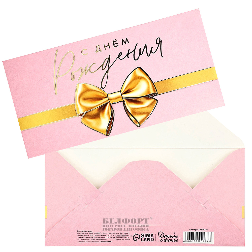 Конверт для денег "С Днем рождения!", 16,5см*8см, бант на розовом