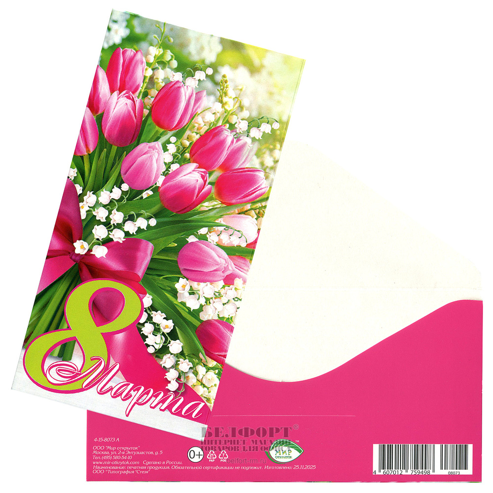 Конверт для денег "8 Марта", 16,7см*8,3см, тюльпаны, розовый