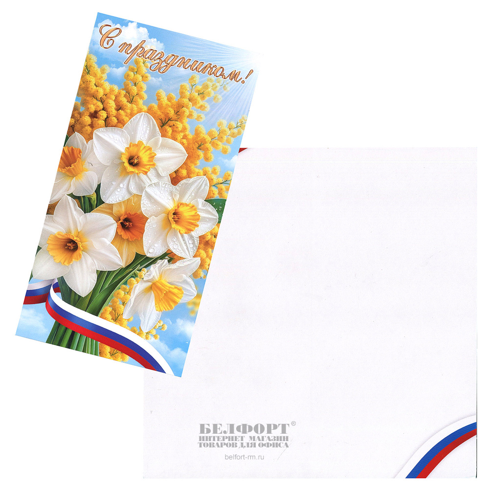 Открытка "С праздником! 8 марта", 21см*10см, мимоза и нарциссы, с символикой, евро
