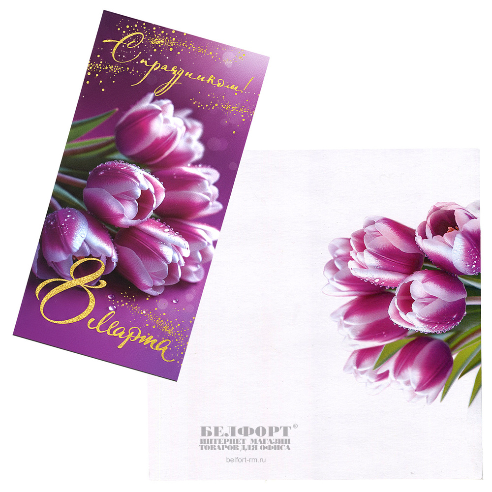 Открытка "С праздником! 8 марта", 21см*10см, тюльпаны, евро, фиолетовая