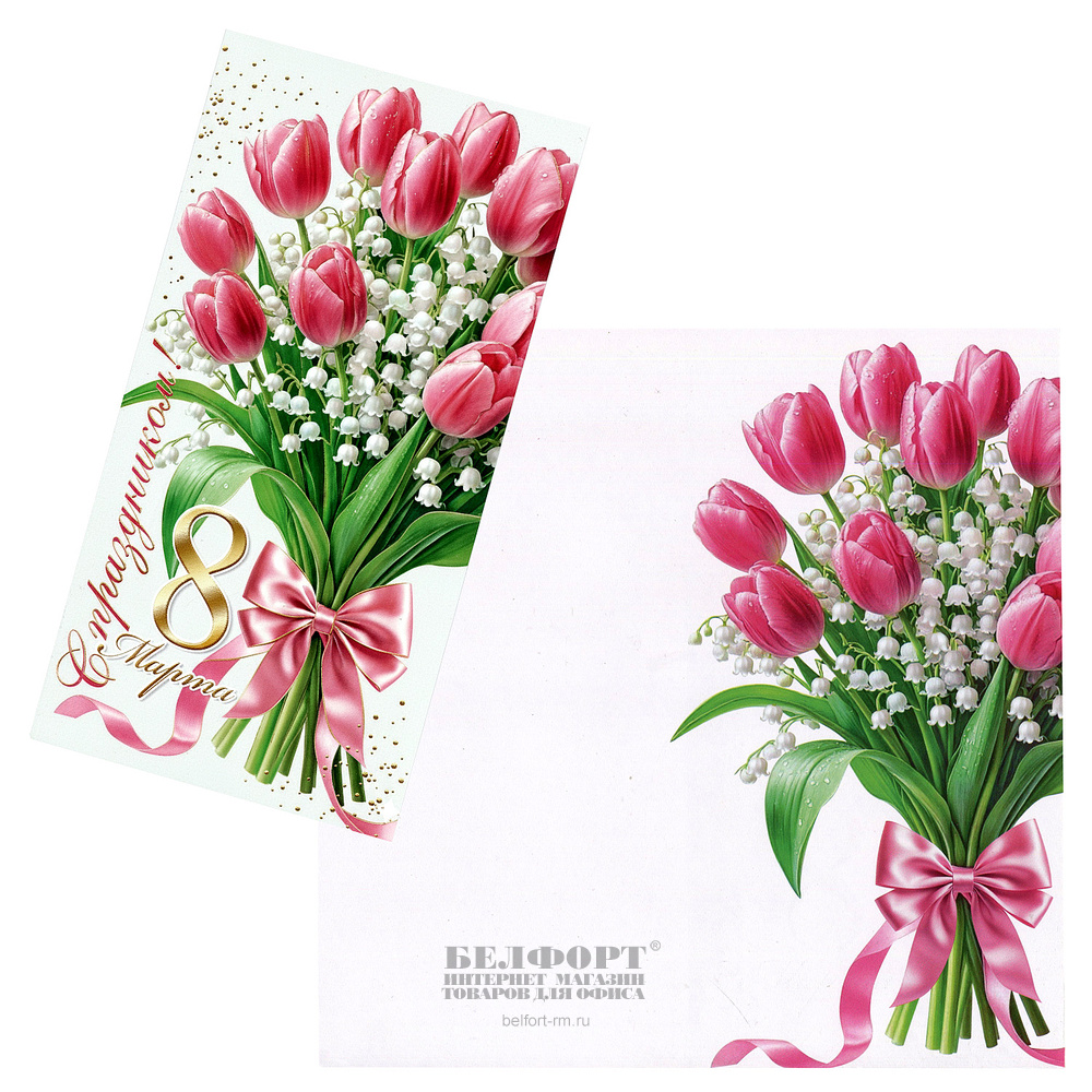 Открытка "С праздником! 8 марта", 21см*10см, тюльпаны, евро, розовая