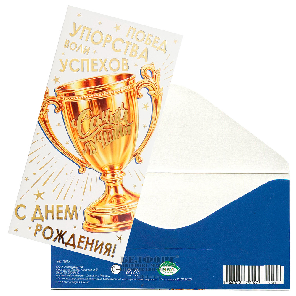 Конверт для денег "С Днем рождения!", 16,7см*8,3см, фольга, кубок